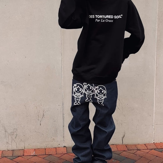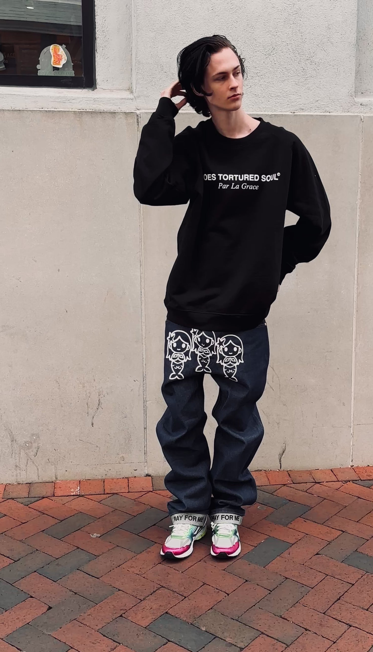 Crafted in America from 15 oz raw denim, these jeans are built to age beautifully—developing unique fades and character with wear. A classic Wrangler silhouette is reimagined through JOES TORTURED SOUL’s lens, featuring a bold front graphic inspired by early streetwear iconography and Virginia culture.
